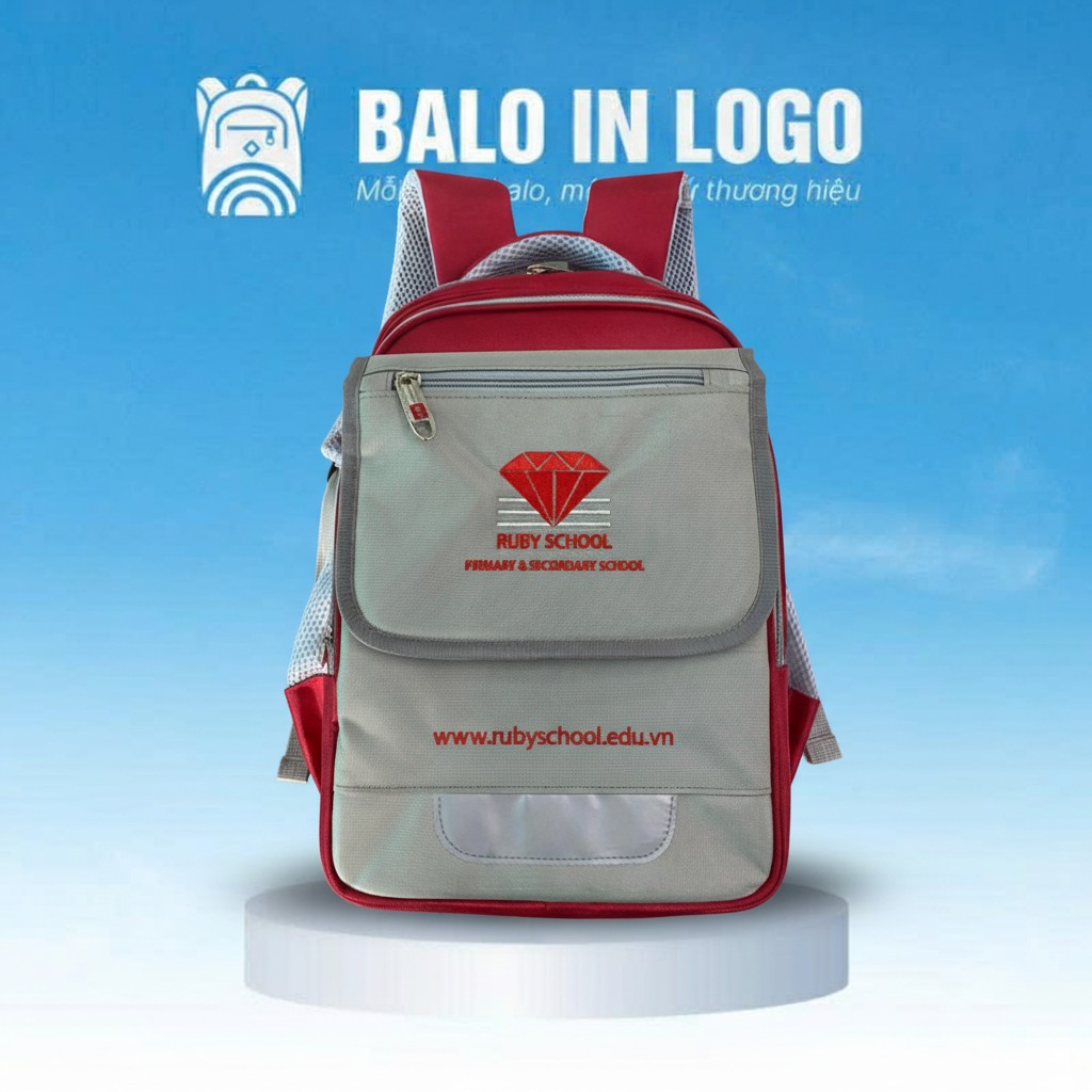 Balo học sinh quà tặng HS-05 phối màu đỏ – xám chuyên nghiệp với logo Ruby School thêu vi tính sắc nét