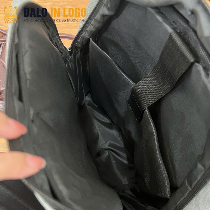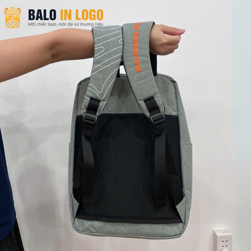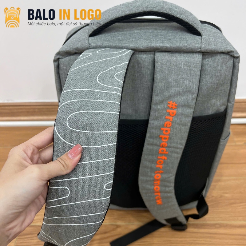 Logo doanh nghiệp in nổi sắc nét ở mặt trước và quai đeo của balo