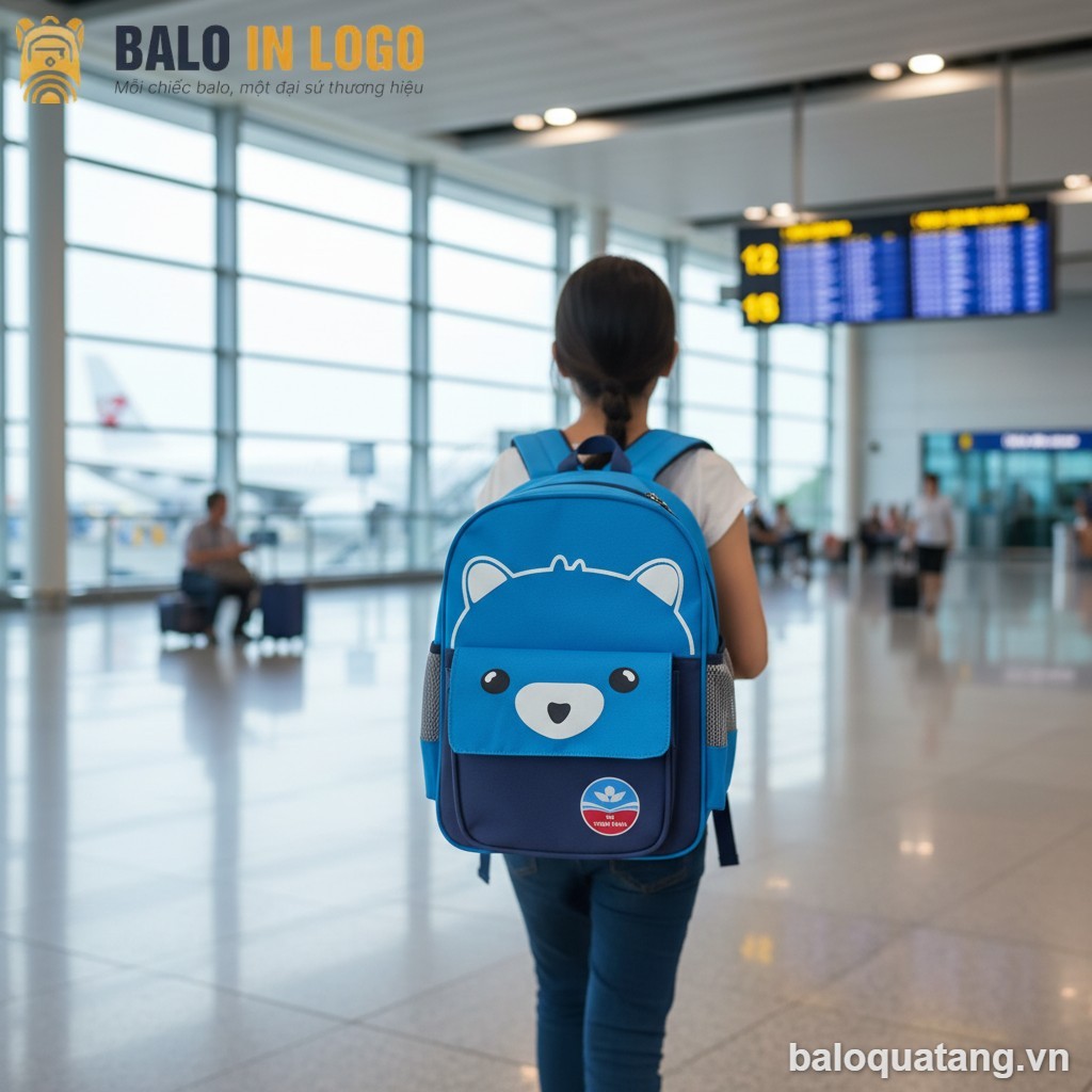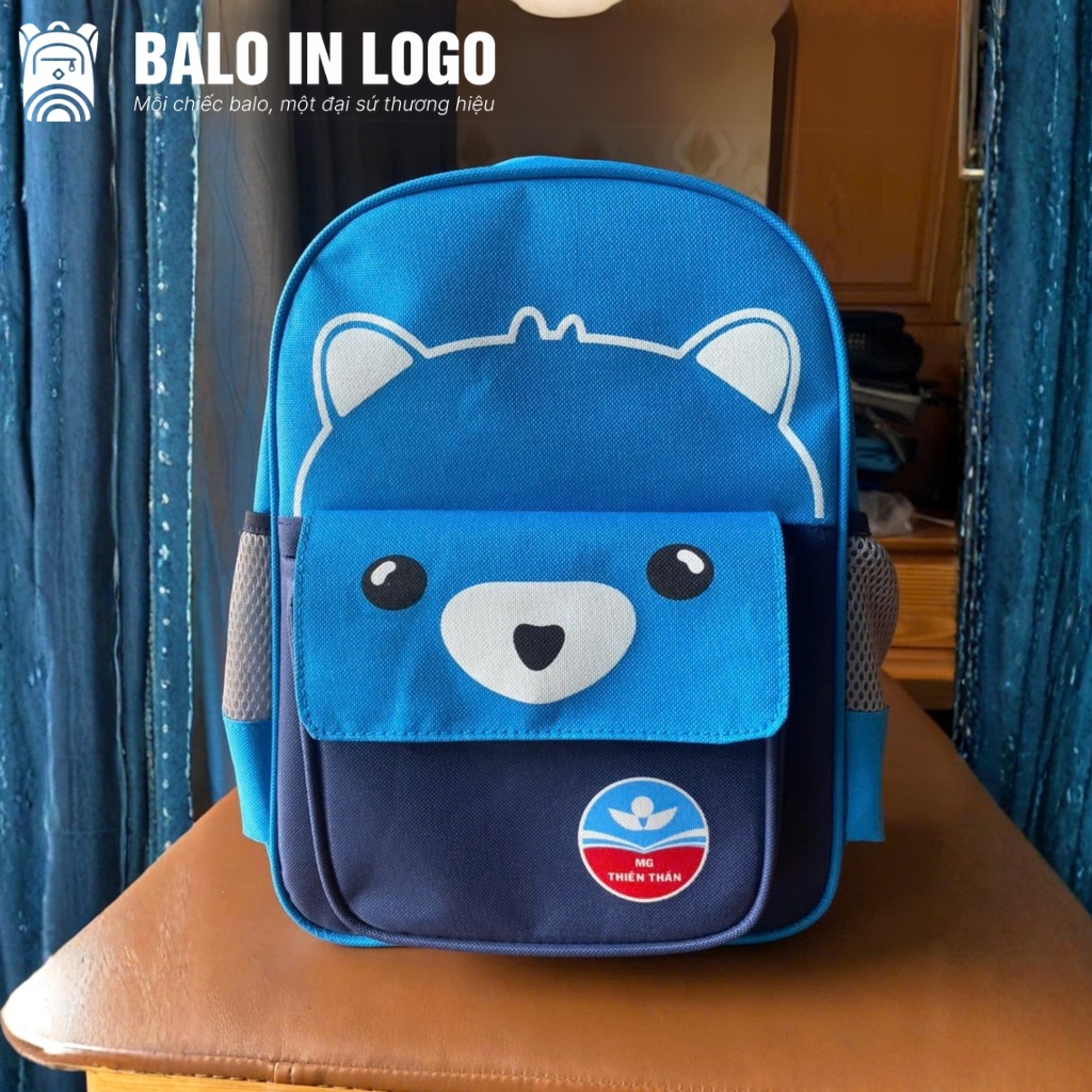 Với kiểu dáng hình hộp đứng form và họa tiết gấu xanh thân thiện, chiếc balo học sinh in logo quà tặng này đáp ứng tốt nhu cầu sử dụng hàng ngày của trẻ nhỏ. Sản phẩm tập trung vào sự an toàn, nhẹ nhàng và bền bỉ, giúp các bé thoải mái mang theo quần áo, sữa và đồ dùng cá nhân đến trường một cách gọn gàng.